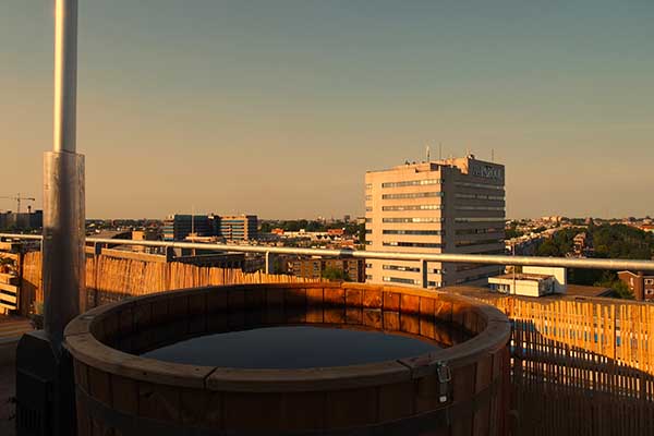 Als je gaat logeren in het Volkshotel vergeet dan vooral je zwemkleding niet! Op de 8e verdieping (die alleen voor hotelgasten open is) vind je de ‘badplaats’. Een chill out plek met ligstoelen, hot tubs en een sauna. Lekker in het bubbelbad hangen met uitzicht over Oost!