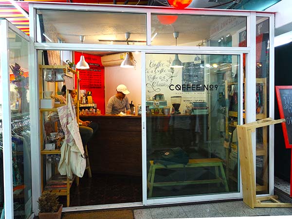Een heel cool koffietentje, want hoe klein ook Coffee No.9 Bangkok is ook nog een soort concept store. Er worden kaarten en andere dingen verkocht van lokale ontwerpers.