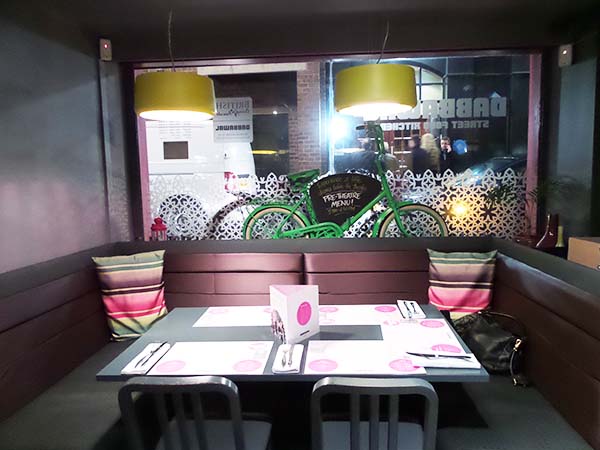 Het interieur bij Dabawal is modern, maar met typisch Indiase kleuren en elementen.