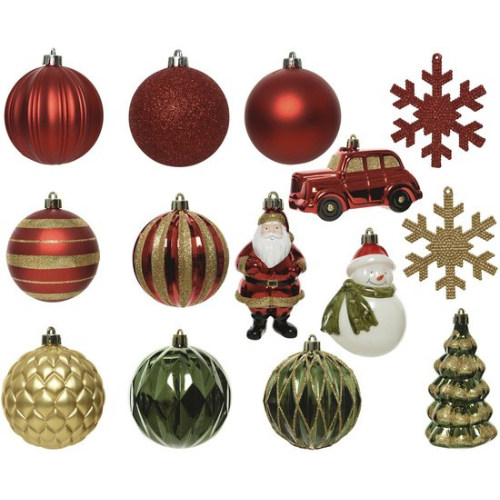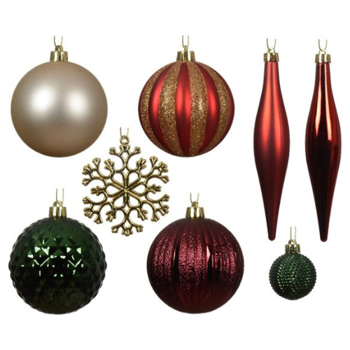 Met deze set van 46 kerstballen en ornamenten in rood, groen en champagne kom je al een heel eind met het versieren van je boom. De mix van pegels, verschillende formaten ballen en decoratieve details geeft meteen een volle, feestelijke look. Voeg er nog een paar losse favoriete ornamenten aan toe en je kerstboom is helemaal ready voor december.