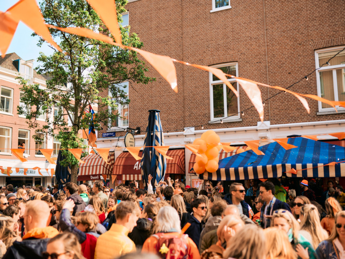 De Nieuwmarkt voelt tijdens Koningsdag altijd als een groot buurtfeest, maar dan met veel meer gezelligheid. Op het plein vind je een podium met muziek en rondom de terrassen is het de hele dag gezellig druk.