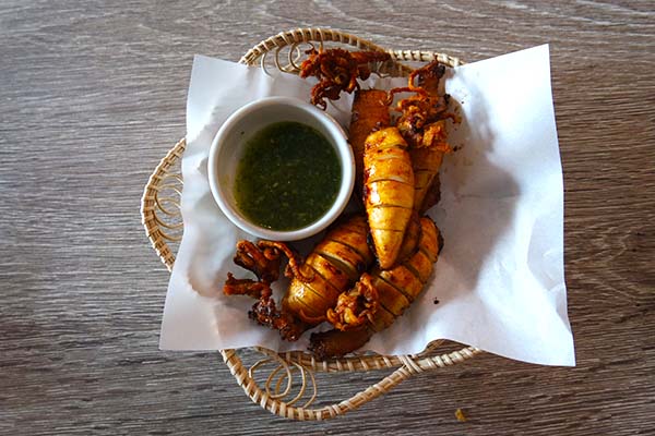 De krab zag er heerlijk uit! Het blijkt een gerecht te zijn met sashimi van krab. Uiteindelijk ga ik toch voor de gevulde pijlstaartinktvis. Ik krijg er ook nog een gerecht met gefrituurde paddestoelen bij. Allebei erg lekker! De gerechten zijn zoals veel gerechten in Thailand trouwens perfect om te delen.