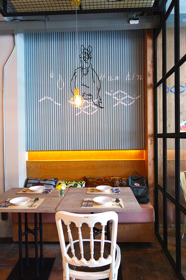 Het interieur bij Lay Lao in Bangkok is super leuk. Met mint groene golfplaten op de muur met schilderingen er op van onder andere een grote krab. De stoelen zijn vintage en op de banken liggen kleurrijke kussens met Vlisco print. Super gezellig.