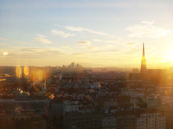 In hotels heb je vaak te gekke skybars of rooftop bars. Het Sofitel in Wenen is er één van! De Loft bar zit op de 18e verdieping en heeft een super mooi uitzicht over Wenen. Overdag kun je bij De Loft bar unchen en van het uitzicht genieten, maar ook leuk is een drankje of cocktail. Het plafond in de Loft bar in Wenen is heel bijzonder, vooral als het buiten donker is. Ik was er met zonsondergang en het uitzicht was spectaculair met de laaghangende zon. Glaasje roze (!) bubbels of een cocktail erbij voor het ultieme cosmopolitische gevoel. I love it!