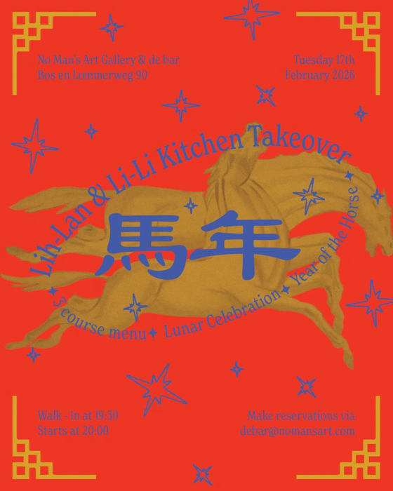 Tijdens Lunar New Year bundelen zussen Lih-Lan en Li-Li hun krachten voor een kitchen takeover bij De Bar at No Man’s Art. Ter ere van het Jaar van het Vuurpaard serveren zij op dinsdag 17 februari een speciaal samengesteld driegangenmenu, dat start na de feestelijke opening van de groepstentoonstelling Bring on the Dancing Horses in de galerie. Verwacht een avond waarin eten, samenzijn en creativiteit centraal staan, met een natuurlijke overlap tussen kunst en gastronomie. Reserveren is aan te raden.