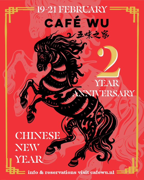 Van 19 tot en met 21 februari is het feest bij Café Wu. Het tweejarig bestaan van de zaak valt dit jaar samen met de start van Chinees Nieuwjaar: het Jaar van het Paard. Speciaal voor deze gelegenheid stelt chef Timo een exclusief menu samen met traditionele nieuwjaarsgerechten, vertaald naar de eigenzinnige stijl van Café Wu. Op zaterdag 21 februari wordt er extra lang doorgefeest met DJ’s, een baijiu bar en pitchers lychee highballs vanaf 22.00 uur.
