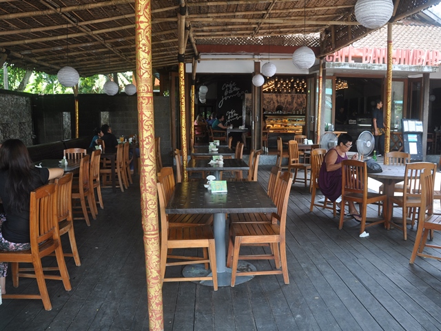 Binnen bij Cafe Batu Jimbar zit je ook leuk! De bar is een echte eye catcher met een vitrine vol heerlijke gebakjes. Rond de bar zit je gezellig aan één van de tafeltjes met de foto’s van typisch Balinese taferelen op de achtergrond.