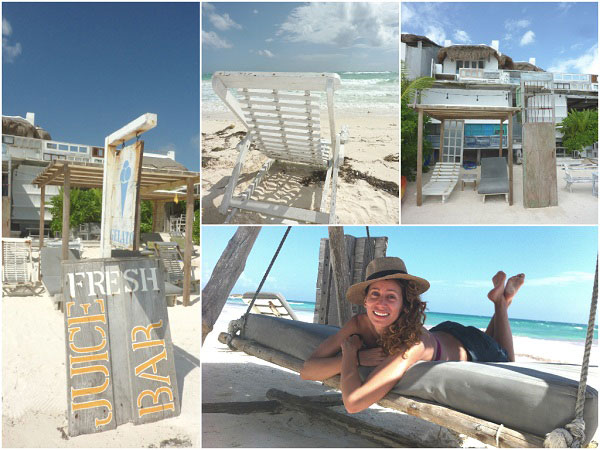 Het is de hele dag goed toeven op de grote ligbedden voor op het strand. Je hoeft er niet voor te betalen, als je af en toe maar wat te snacken of te drinken haalt. En dan maar kwijlen naar al het moois dat voorbij loopt in leuke zwempakjes. Je zult zien dat er een hoop mooie mensen komen in Tulum. Helemaaaal niet verkeerd zo.